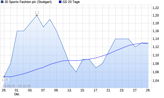 Mit dem Rücksetzer auf 1,12 EUR hat die JD Sports Fashion-Aktie am 28.10.2025 die 20-Tage-Linie nach unten gekreuzt.Die JD Sports Fashion-Aktie befindet sich seit dem 20.08.2025 ...weiterlesen
