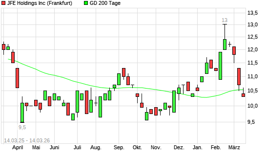 Mit dem Rücksetzer auf 10,30 EUR hat die JFE Holdings-Aktie am 13.03.2026 die 200-Tage-Linie nach unten gekreuzt.Die JFE Holdings-Aktie befand sich seit dem 10.03.2026 ...weiterlesen