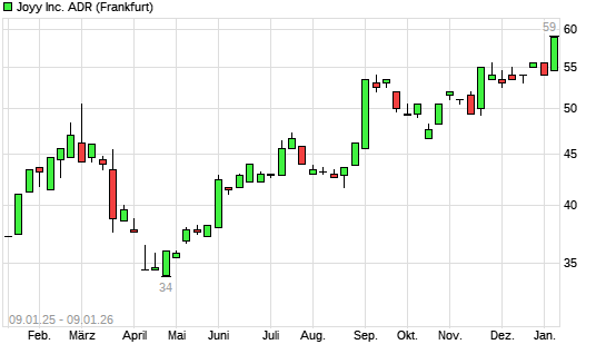 Mit dem Anstieg auf 59,00 EUR hat die JOYY-Aktie (ISIN US46591M1099) am 09.01.2026 ein neues 3-Jahres-Hoch erreicht und damit den Kurs vom 08.01.2026 eingestellt.Die JOYY-Aktie befindet sich ...weiterlesen