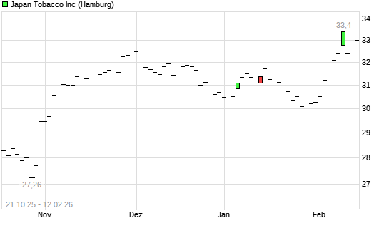 Mit dem Anstieg auf 33,34 EUR hat die Japan Tobacco-Aktie (ISIN JP3726800000) am 11.02.2026 ein neues 5-Jahres-Hoch erreicht und damit den Kurs vom 09.02.2026 eingestellt.Die ...weiterlesen