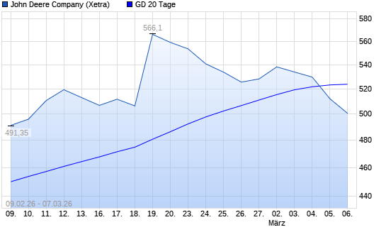 Mit dem Rücksetzer auf 508,30 EUR hat die John Deere-Aktie am 06.03.2026 die 20-Tage-Linie nach unten gekreuzt.Die John Deere-Aktie befindet sich seit dem 13.01.2026 im ...weiterlesen