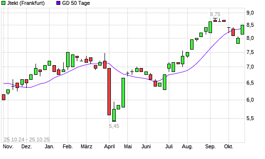 Mit dem Anstieg auf 8,50 EUR hat die Jtekt-Aktie am 24.10.2025 die 50-Tage-Linie nach oben gekreuzt.Die Jtekt-Aktie befindet sich seit dem 27.06.2025 im langfristigen Aufwärtstrend und hat in ...weiterlesen