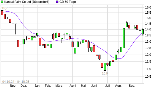 Mit dem Anstieg auf 14,00 EUR hat die Kansai Paint-Aktie am 03.10.2025 die 50-Tage-Linie nach oben gekreuzt.Die Kansai Paint-Aktie befindet sich seit dem 12.08.2025 im ...weiterlesen