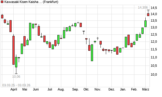 Mit dem Anstieg auf 14,31 EUR hat die Kawasaki Kisen Kaisha-Aktie (ISIN JP3223800008) am 02.03.2026 ein neues 12-Monats-Hoch erreicht und damit den Kurs vom 04.03.2025 ...weiterlesen
