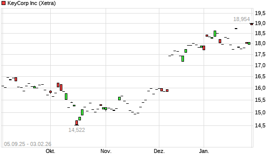 Mit dem Anstieg auf 19,04 EUR hat die KeyCorp-Aktie (ISIN US4932671088) am 06.02.2026 ein neues 3-Jahres-Hoch erreicht und damit den Kurs vom 05.02.2026 eingestellt.Die KeyCorp-Aktie befindet ...weiterlesen