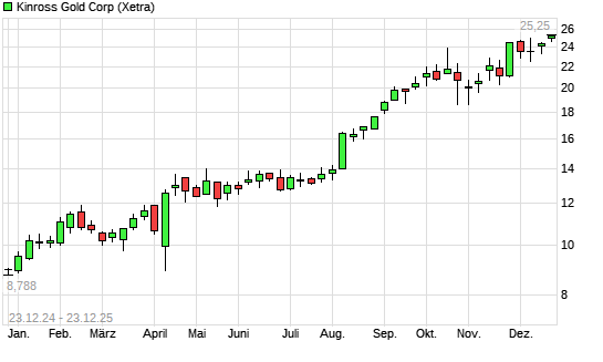 Mit dem Anstieg auf 25,00 EUR hat die Kinross Gold-Aktie (ISIN CA4969024047) am 22.12.2025 ein neues All-Time-High erreicht und damit den Kurs vom 11.12.2025 eingestellt.Die Kinross Gold-Aktie ...weiterlesen