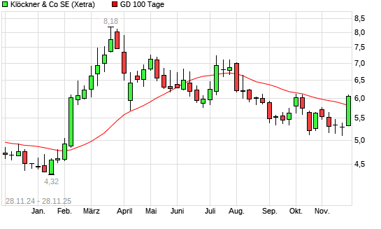 Mit dem Anstieg auf 5,92 EUR hat die Klöckner-Aktie am 27.11.2025 die 100-Tage-Linie nach oben gekreuzt.Die Klöckner-Aktie befindet sich seit dem 28.08.2025 im langfristigen Abwärtstrend ...weiterlesen