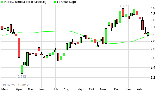 Mit dem Anstieg auf 3,23 EUR hat die Konica Minolta-Aktie am 18.02.2026 die 200-Tage-Linie nach oben gekreuzt.Die Konica Minolta-Aktie befand sich seit dem 17.02.2026 im ...weiterlesen