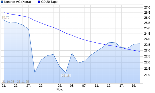 Mit dem Rücksetzer auf 22,96 EUR hat die Kontron-Aktie am 20.11.2025 die 20-Tage-Linie nach unten gekreuzt.Die Kontron-Aktie befindet sich seit dem 28.10.2025 im langfristigen Abwärtstrend ...weiterlesen
