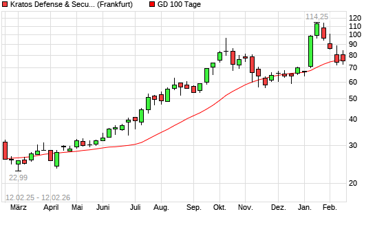 Mit dem Rücksetzer auf 72,70 EUR hat die Kratos Defense & Security Solutions-Aktie am 11.02.2026 die 100-Tage-Linie nach unten gekreuzt.Die Kratos Defense & Security Solutions-Aktie ...weiterlesen