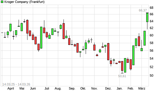 Mit dem Anstieg auf 66,37 EUR hat die Kroger Company-Aktie (ISIN US5010441013) am 13.03.2026 ein neues All-Time-High erreicht und damit den Kurs vom 12.05.2025 eingestellt.Die ...weiterlesen