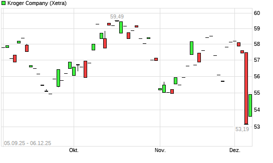 Mit dem Rücksetzer auf 53,67 EUR hat die Kroger Company-Aktie (ISIN US5010441013) am 05.12.2025 ein neues 12-Monats-Tief erreicht und damit den Kurs vom 10.12.2024 eingestellt.Die Kroger ...weiterlesen