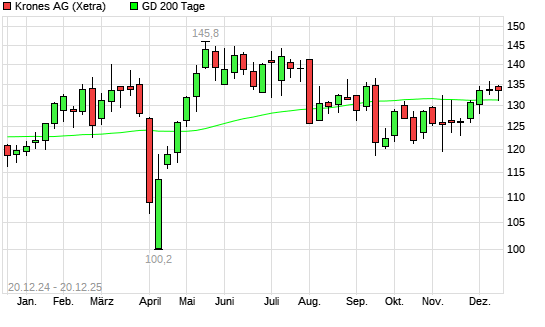 Mit dem Anstieg auf 131,80 EUR hat die Krones-Aktie am 19.12.2025 die 200-Tage-Linie nach oben gekreuzt.Die Krones-Aktie befand sich seit dem 18.12.2025 im langfristigen Abwärtstrend und hat ...weiterlesen