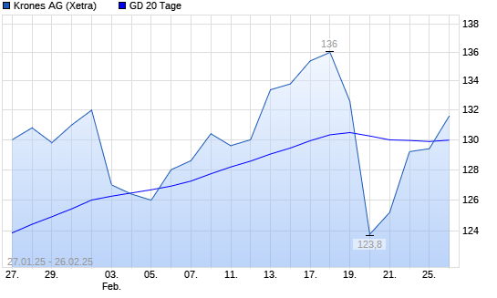 Mit dem Anstieg auf 130,60 EUR hat die Krones-Aktie am 25.02.2025 die 20-Tage-Linie nach oben gekreuzt.Die Krones-Aktie befindet sich seit dem 15.01.2025 im langfristigen Aufwärtstrend und hat ...weiterlesen