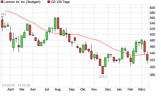 Mit dem Rücksetzer auf 418,40 EUR hat die LENNOX International-Aktie am 13.03.2026 die 100-Tage-Linie nach unten gekreuzt.Die LENNOX International-Aktie befindet sich seit ...weiterlesen