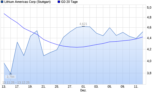 Mit dem Rücksetzer auf 4,36 EUR hat die LITHIUM AMERICAS-Aktie am 12.12.2025 die 20-Tage-Linie nach unten gekreuzt.Die LITHIUM AMERICAS-Aktie befindet sich seit dem 24.09.2025 ...weiterlesen