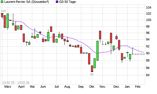 Mit dem Anstieg auf 90,00 EUR hat die Laurent-Perrrier-Aktie am 12.02.2026 die 50-Tage-Linie nach oben gekreuzt.Die Laurent-Perrrier-Aktie befindet sich seit dem 14.01.2026 im langfristigen ...weiterlesen