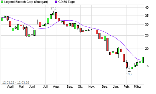 Mit dem Anstieg auf 16,80 EUR hat die Legend Biotech Corp-Aktie am 11.03.2026 die 50-Tage-Linie nach oben gekreuzt.Die Legend Biotech Corp-Aktie befindet sich seit dem 07.08.2025 ...weiterlesen