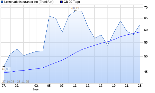Mit dem Anstieg auf 63,08 EUR hat die Lemonade-Aktie am 24.11.2025 die 20-Tage-Linie nach oben gekreuzt.Die Lemonade-Aktie befindet sich seit dem 05.08.2025 im langfristigen Aufwärtstrend und ...weiterlesen