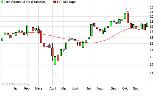 Mit dem Anstieg auf 18,68 EUR hat die Levi Strauss & Co-Aktie am 26.11.2025 die 100-Tage-Linie nach oben gekreuzt.Die Levi Strauss & Co-Aktie befindet sich seit dem 02.07.2025 im langfristigen ...weiterlesen