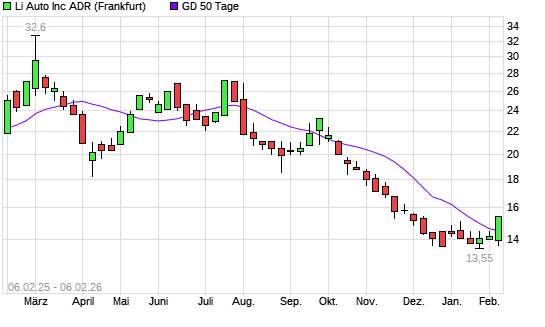 Mit dem Anstieg auf 14,75 EUR hat die Li Auto-Aktie am 05.02.2026 die 50-Tage-Linie nach oben gekreuzt.Die Li Auto-Aktie befindet sich seit dem 30.07.2025 im langfristigen Abwärtstrend und hat ...weiterlesen