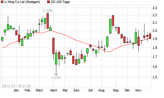 Mit dem Rücksetzer auf 1,87 EUR hat die Li Ning Co-Aktie am 28.11.2025 die 100-Tage-Linie nach unten gekreuzt.Die Li Ning Co-Aktie befindet sich seit dem 05.11.2025 im ...weiterlesen