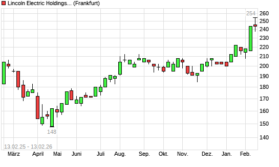 Mit dem Anstieg auf 254,00 EUR hat die Lincoln Electric-Aktie (ISIN US5339001068) am 12.02.2026 ein neues All-Time-High erreicht und damit den Kurs vom 09.02.2026 eingestellt.Die Lincoln Electric-Aktie ...weiterlesen
