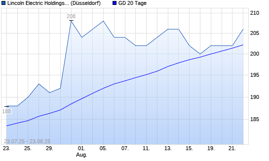 Mit dem Rücksetzer auf 202,00 EUR hat die Lincoln Electric-Aktie am 22.08.2025 die 20-Tage-Linie nach unten gekreuzt.Die Lincoln Electric-Aktie befindet sich seit dem 03.07.2025 im langfristigen ...weiterlesen