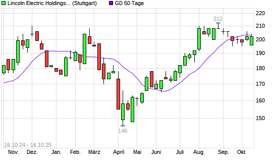 Mit dem Anstieg auf 204,00 EUR hat die Lincoln Electric-Aktie am 15.10.2025 die 50-Tage-Linie nach oben gekreuzt.Die Lincoln Electric-Aktie befindet sich seit dem 03.07.2025 ...weiterlesen