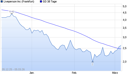 Mit dem Anstieg auf 2,56 EUR hat die LivePerson-Aktie am 04.03.2026 die 38-Tage-Linie nach oben gekreuzt.Der Abstand zur 200-Tage-Linie beträgt aktuell -64,79%. momentan ...weiterlesen