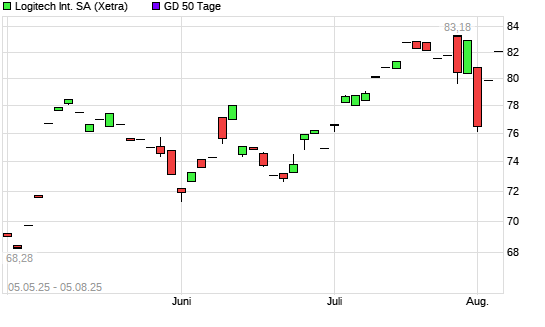 Mit dem Anstieg auf 78,10 EUR hat die Logitech-Aktie am 04.08.2025 die 50-Tage-Linie nach oben gekreuzt.Die Logitech-Aktie befindet sich seit dem 01.08.2025 im langfristigen Abwärtstrend und ...weiterlesen