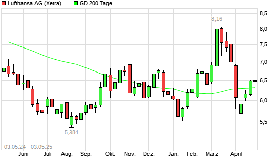 Mit dem Anstieg auf 6,44 EUR hat die Lufthansa-Aktie am 02.05.2025 die 200-Tage-Linie nach oben gekreuzt.Die Lufthansa-Aktie befand sich seit dem 29.04.2025 im langfristigen Abwärtstrend und ...weiterlesen