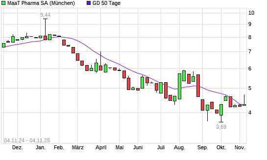 Mit dem Anstieg auf 4,11 EUR hat die MAAT PHARMA-Aktie am 03.11.2025 die 50-Tage-Linie nach oben gekreuzt.Der Abstand zur 200-Tage-Linie beträgt aktuell -22,00%. ...weiterlesen