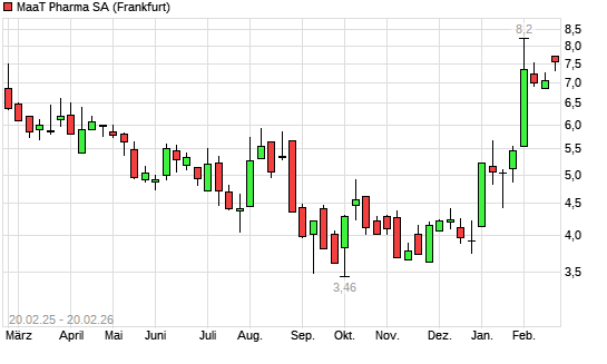 Mit dem Anstieg auf 7,54 EUR hat die MAAT PHARMA-Aktie (ISIN FR0012634822) am 19.02.2026 ein neues 12-Monats-Hoch erreicht und damit den Kurs vom 20.02.2025 eingestellt.Die ...weiterlesen