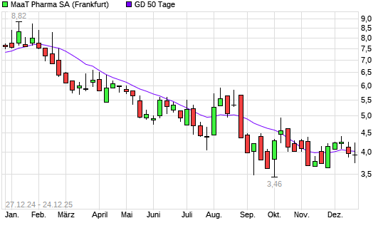 Mit dem Rücksetzer auf 3,93 EUR hat die MAAT PHARMA-Aktie am 23.12.2025 die 50-Tage-Linie nach unten gekreuzt.Der Abstand zur 200-Tage-Linie beträgt aktuell -18,17%. ##trendBox## Die ...weiterlesen