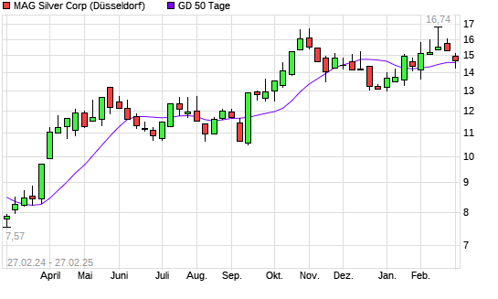 Mit dem Anstieg auf 14,54 EUR hat die MAG Silver Corp.-Aktie am 26.02.2025 die 50-Tage-Linie nach oben gekreuzt.Die MAG Silver Corp.-Aktie befindet sich seit dem 28.03.2024 im langfristigen ...weiterlesen