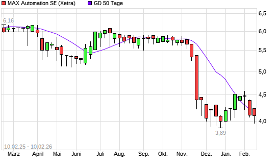 Mit dem Rücksetzer auf 4,03 EUR hat die MAX Automation-Aktie am 09.02.2026 die 50-Tage-Linie nach unten gekreuzt.Die MAX Automation-Aktie befindet sich seit dem 05.11.2025 ...weiterlesen