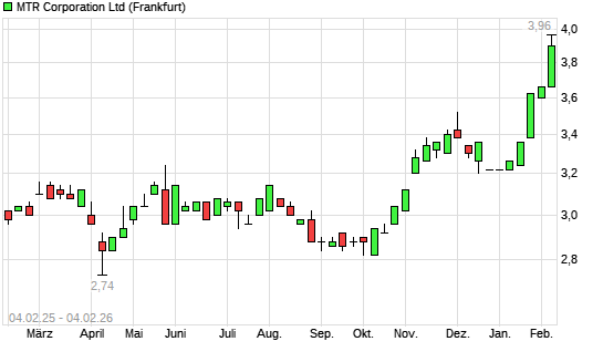 Mit dem Anstieg auf 3,96 EUR hat die MTR Corporation-Aktie (ISIN HK0066009694) am 03.02.2026 ein neues 12-Monats-Hoch erreicht und damit den Kurs vom 02.02.2026 eingestellt.Die MTR Corporation-Aktie ...weiterlesen