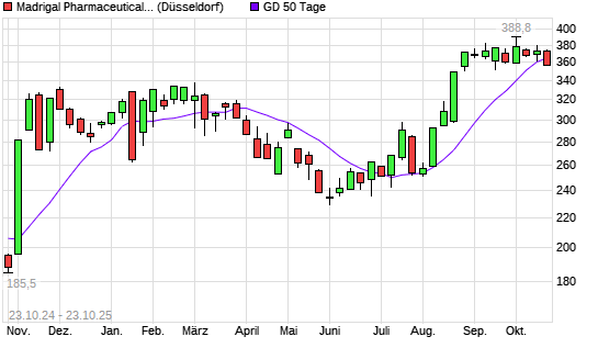 Mit dem Rücksetzer auf 358,20 EUR hat die Madrigal Pharmaceuticals-Aktie am 22.10.2025 die 50-Tage-Linie nach unten gekreuzt.Die Madrigal Pharmaceuticals-Aktie befindet sich seit dem 05.08.2025 ...weiterlesen