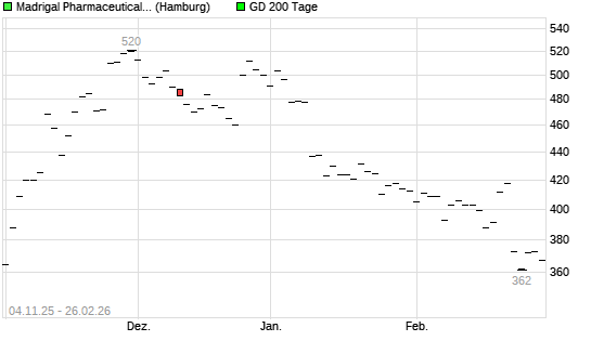 Mit dem Rücksetzer auf 367,80 EUR hat die Madrigal Pharmaceuticals-Aktie am 25.02.2026 die 200-Tage-Linie nach unten gekreuzt.Die Madrigal Pharmaceuticals-Aktie befand sich seit ...weiterlesen