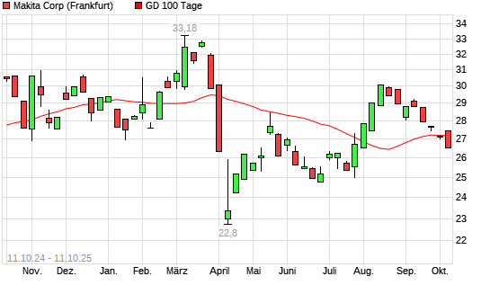Mit dem Rücksetzer auf 26,52 EUR hat die Makita Corp-Aktie am 10.10.2025 die 100-Tage-Linie nach unten gekreuzt.Die Makita Corp-Aktie befindet sich seit dem 22.09.2025 im langfristigen ...weiterlesen