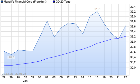 Mit dem Anstieg auf 31,64 EUR hat die Manulife Financial-Aktie am 22.01.2026 die 20-Tage-Linie nach oben gekreuzt.Die Manulife Financial-Aktie befindet sich seit dem 21.10.2025 im langfristigen ...weiterlesen