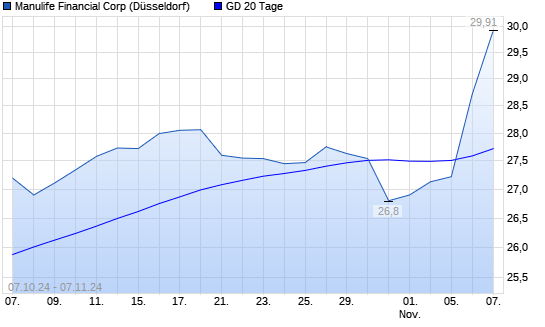 Mit dem Anstieg auf 28,31 EUR hat die Manulife Financial-Aktie am 06.11.2024 die 20-Tage-Linie nach oben gekreuzt.Die Manulife Financial-Aktie befindet sich seit dem 06.08.2024 im langfristigen ...weiterlesen