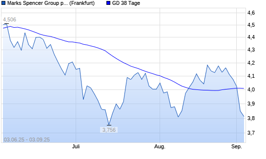 Mit dem Rücksetzer auf 3,85 EUR hat die Marks Spencer Group-Aktie am 02.09.2025 die 38-Tage-Linie nach unten gekreuzt.Die Marks Spencer Group-Aktie befindet sich seit dem 12.06.2025 im ...weiterlesen
