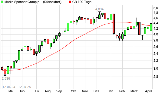 Mit dem Rücksetzer auf 4,29 EUR hat die Marks Spencer Group-Aktie am 11.04.2025 die 100-Tage-Linie nach unten gekreuzt.Die Marks Spencer Group-Aktie befindet sich seit dem 10.04.2025 im ...weiterlesen