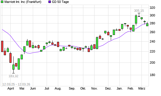 Mit dem Rücksetzer auf 279,50 EUR hat die Marriott International-Aktie am 11.03.2026 die 50-Tage-Linie nach unten gekreuzt.Die Marriott International-Aktie befindet sich seit ...weiterlesen