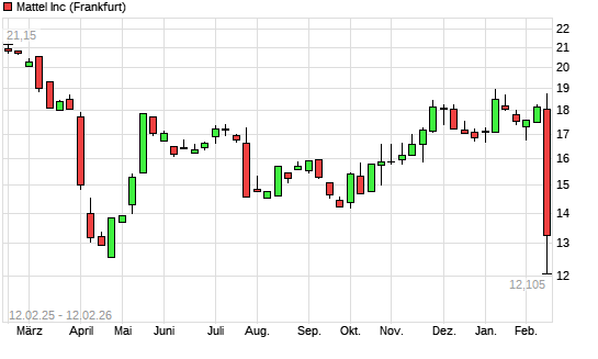 Mit dem Rücksetzer auf 13,13 EUR hat die Mattel-Aktie (ISIN US5770811025) am 11.02.2026 ein neues 6-Monats-Tief erreicht und damit den Kurs vom 26.09.2025 eingestellt.Die ...weiterlesen