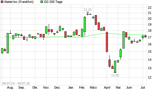 Mit dem Rücksetzer auf 16,95 EUR hat die Mattel-Aktie am 08.07.2025 die 200-Tage-Linie nach unten gekreuzt.Die Mattel-Aktie befand sich seit dem 07.07.2025 im langfristigen Aufwärtstrend ...weiterlesen