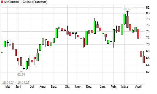 Mit dem Rücksetzer auf 64,60 EUR hat die McCormick-Aktie (ISIN US5797802064) am 17.04.2025 ein neues 6-Monats-Tief erreicht und damit den Kurs vom 16.04.2025 eingestellt.Die McCormick-Aktie ...weiterlesen