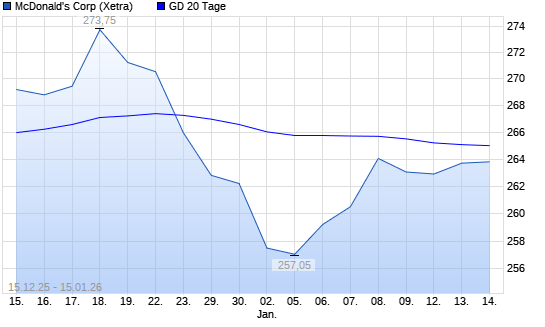 Mit dem Anstieg auf 264,05 EUR hat die McDonald's-Aktie am 14.01.2026 die 20-Tage-Linie nach oben gekreuzt.Die McDonald's-Aktie befindet sich seit dem 23.12.2025 im langfristigen Abwärtstrend ...weiterlesen